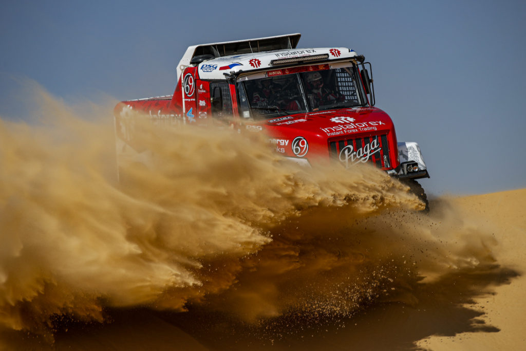 Aleš Loprais, Khalid Alkendi a Petr Pokora mají v maratonském bivaku po desáté etapě Rally Dakar 2020 napilno. Nová Praga V4S DKR potřebuje péči a posádka se tentokrát musí obejít bez pomoci svých mechaniků. Přestože na středeční speciálce nešlo z pohledu Instaforex Loprais Teamu vše úplně hladce, je červeno-bílo-černý soutěžní speciál opět o kousek blíž průběžně třetímu Sergeji Vjazovičovi s Mazem.